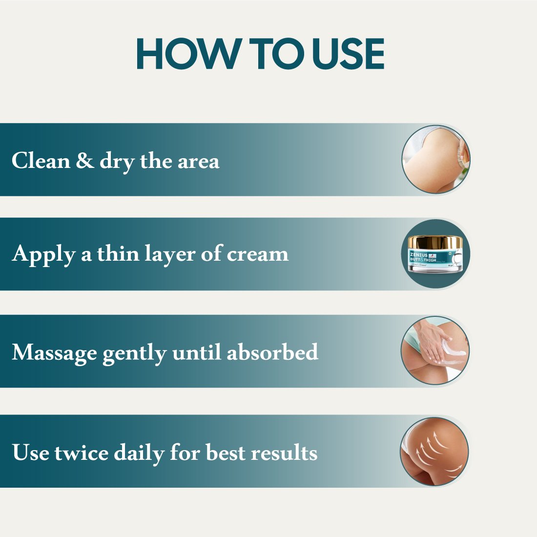 Clean and dry the area. Apply a small amount of cream and gently massage until fully absorbed. Use twice daily for best results.