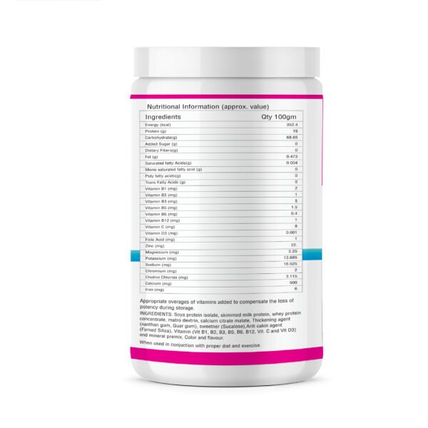 - Protein Blend: Soya Protein Isolate, Skimmed Milk Protein, Whey Protein Concentrate
