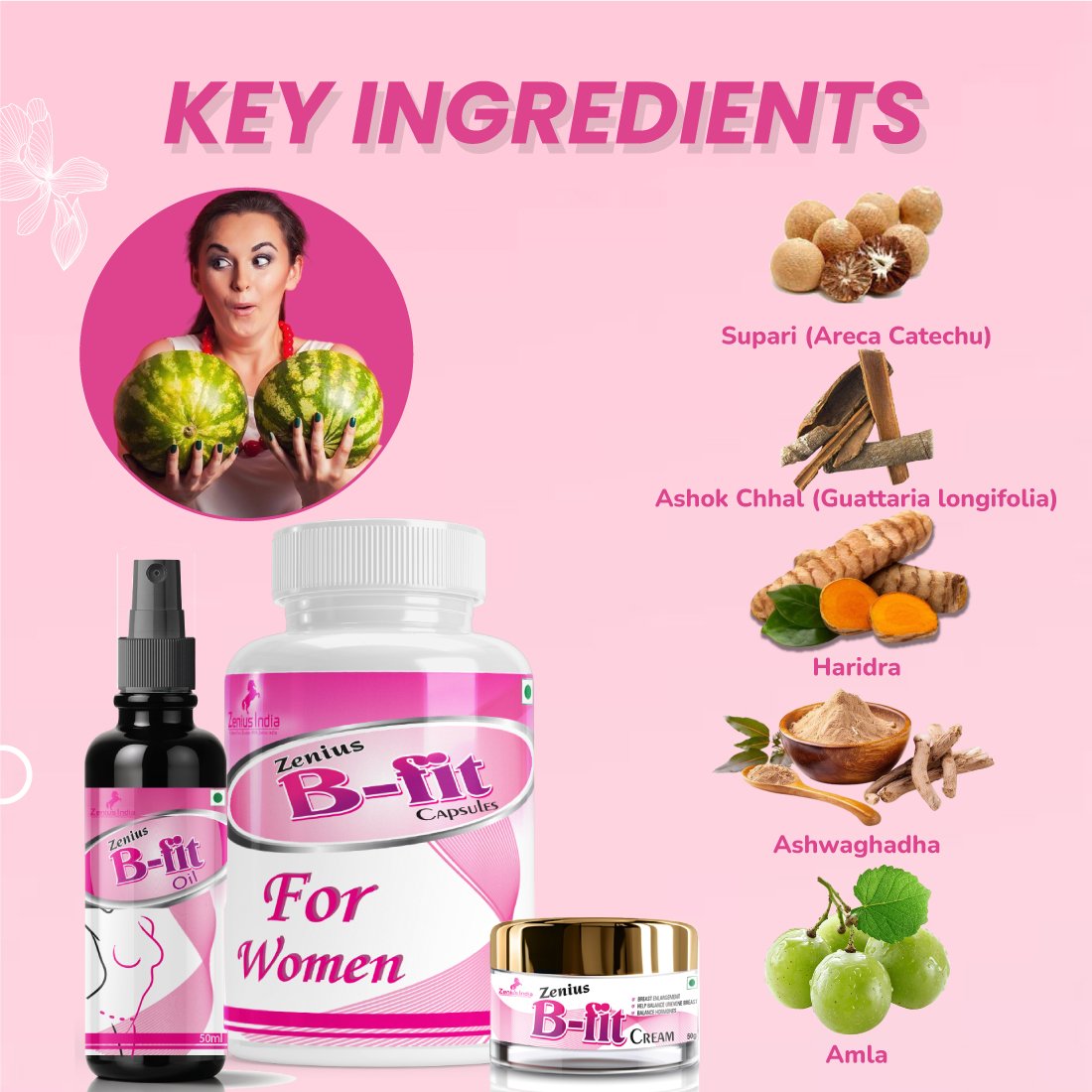 1.Discover natural beauty with Zenius B Fit Combo Kit: 60 capsules, 50g cream, 50ml oil. 2.Enhance charm safely for a captivating appearance. 3.Elevate confidence with this proven formula. 4.Nourishes and firms breast tissue, promoting a fuller and toned look. 5.Boosts skin elasticity, reducing stretch marks and enhancing skin texture. 6.Improves overall breast health, providing essential nutrients for well-being and vitality.