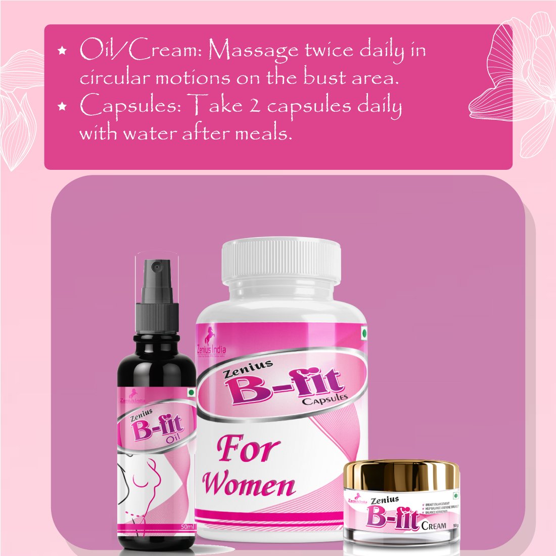 (Capsules): Take 1 capsule twice a day with milk or warm water + (Cream): Apply your targeted area a small amount of B Fit cream for 3-4 minutes nightly + (Oil): Apply Zenius B Fit oil in the morning, gently massaging the target area for 2 minutes