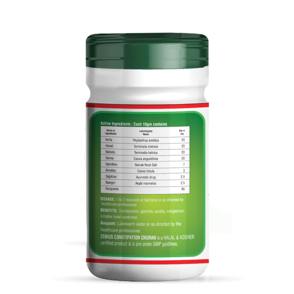 • Dosage: Take 1-2 teaspoons of Zenius Constipation Churan with a glass of lukewarm water at bedtime.
